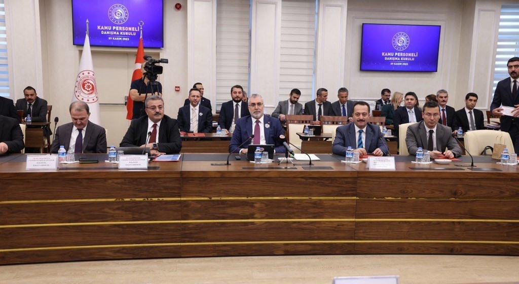 2023 yılının son Kamu Personeli Danışma Kurulu Toplantısı 9 Kasım 2023 tarihinde Bakanlığımız ev sahipliğinde gerçekleştirilmiştir. Çalışma ve Sosyal Güvenlik Bakanımız Sayın Prof. Dr. Vedat IŞIKHAN ’ın başkanlığında; kamu kurum ve kuruluşları ve kamu görevlileri sendikaları ve konfederasyonlarının temsilcilerinin katılımı ile gerçekleşen kamu personeli danışma kurulu toplantısında kamuda sosyal diyaloğun artırılması ve kamu görevlilerinin karşılaşmış olduğu temel sorunlar ele alınarak kamu görevlilerinin ve kamu personel yönetiminin daha etkin ve dinamik olması amaçlanmıştır.