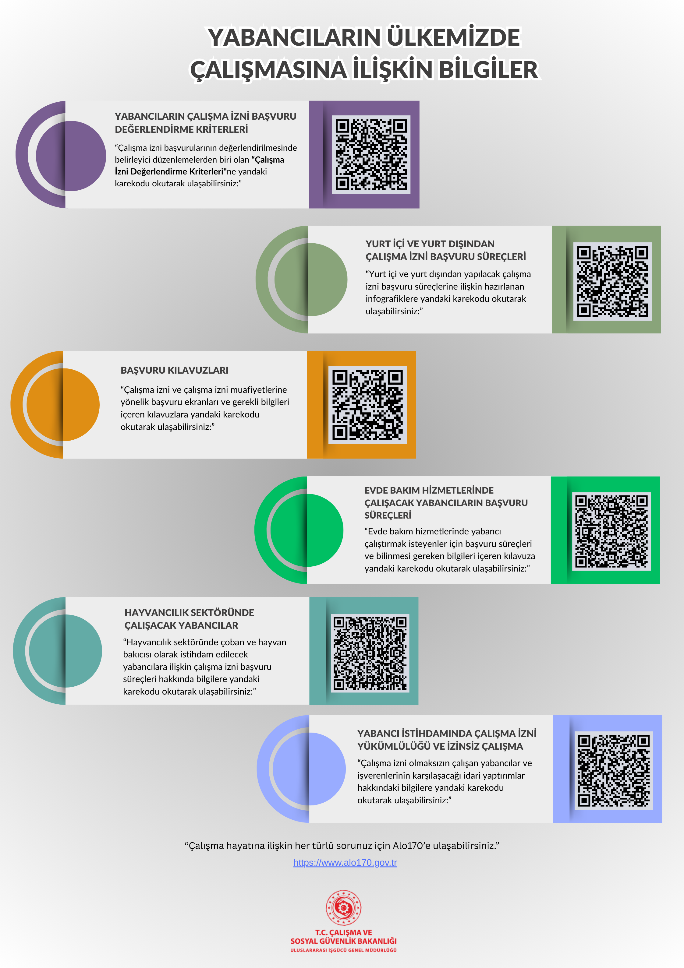Genel Müdürlüğümüz tarafından yabancıların işgücü piyasasına erişim süreçlerine ilişkin; çalışma izni başvuru süreçleri, çalışma izni değerlendirme kriterleri ile yabancıların ülkemizde çalışmasına ilişkin yükümlülükleri içeren farklı konuların tek bir görselde toplandığı ve kullanıcıları konulara yönelik detaylı bilgilere yönlendiren QR kodların yer aldığı Türkçe ve İngilizce broşür hazırlanmıştır.