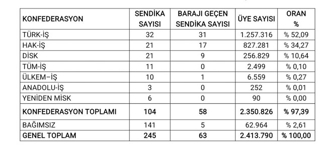 17 Ocak 2026 tarihli Resmî Gazete’de yer alan verilere göre, Türkiye genelinde sendikalı işçi sayısı 2,4 milyonu aştı.