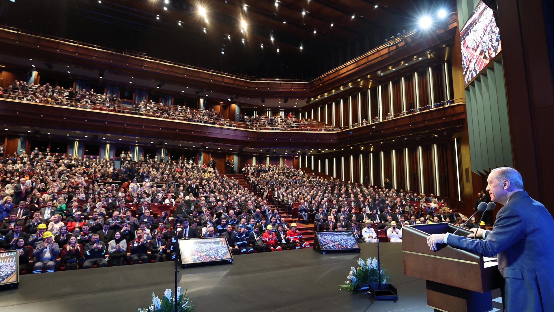 Bir yandan Türkiye’nin büyüme ve kalkınma sürecine hız verirken, diğer yandan adil ve rekabetçi bir düzenin oluşmasını sağladıklarını belirten Cumhurbaşkanı Erdoğan, “Bölgesinde ve dünyada sözü geçen, demokrasi ve kalkınma hamleleriyle küresel ölçekte temayüz eden bir ülkeyi milletimizle sırt sırta vererek adeta yeni baştan inşa ettik. Üretim ve istihdamı ekonomi ve maliye politikamızın merkezine yerleştirmek, bu suretle büyüme ve kalkınma atılımlarımızı sürdürülebilir hale getirdik. Son dönemde bilhassa istihdam ve nitelikli işgücü alanında devreye aldığımız programlarla başarı hanemize yepyeni kazanımlar ekledik” diye konuştu.