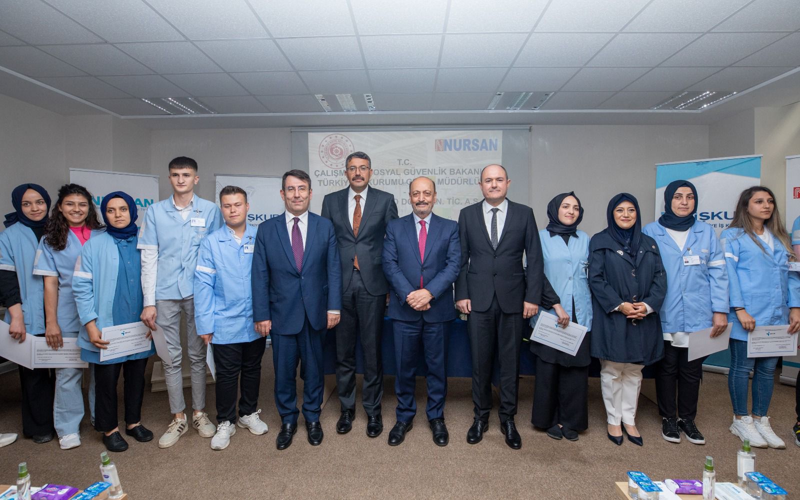 Konuşmaların ardından Nursan Yönetim Kurulu Başkanı Kağan Yamakoğlu ve Bakan Bilgin, işbaşı eğitim programını tamamlayan işçilere belgelerini takdim etti.